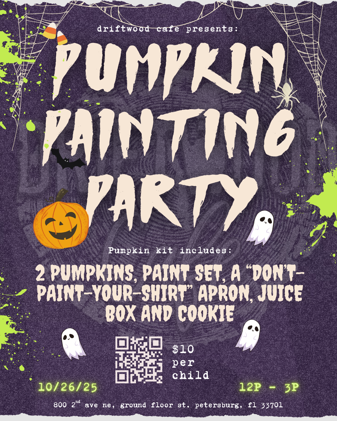 Bring the kids for a festive family day at Driftwood Café. Each child will get two mini pumpkins, a paint set, and their own apron to get creative. After the masterpieces are complete, they can sip on a juice box and enjoy a cookie.